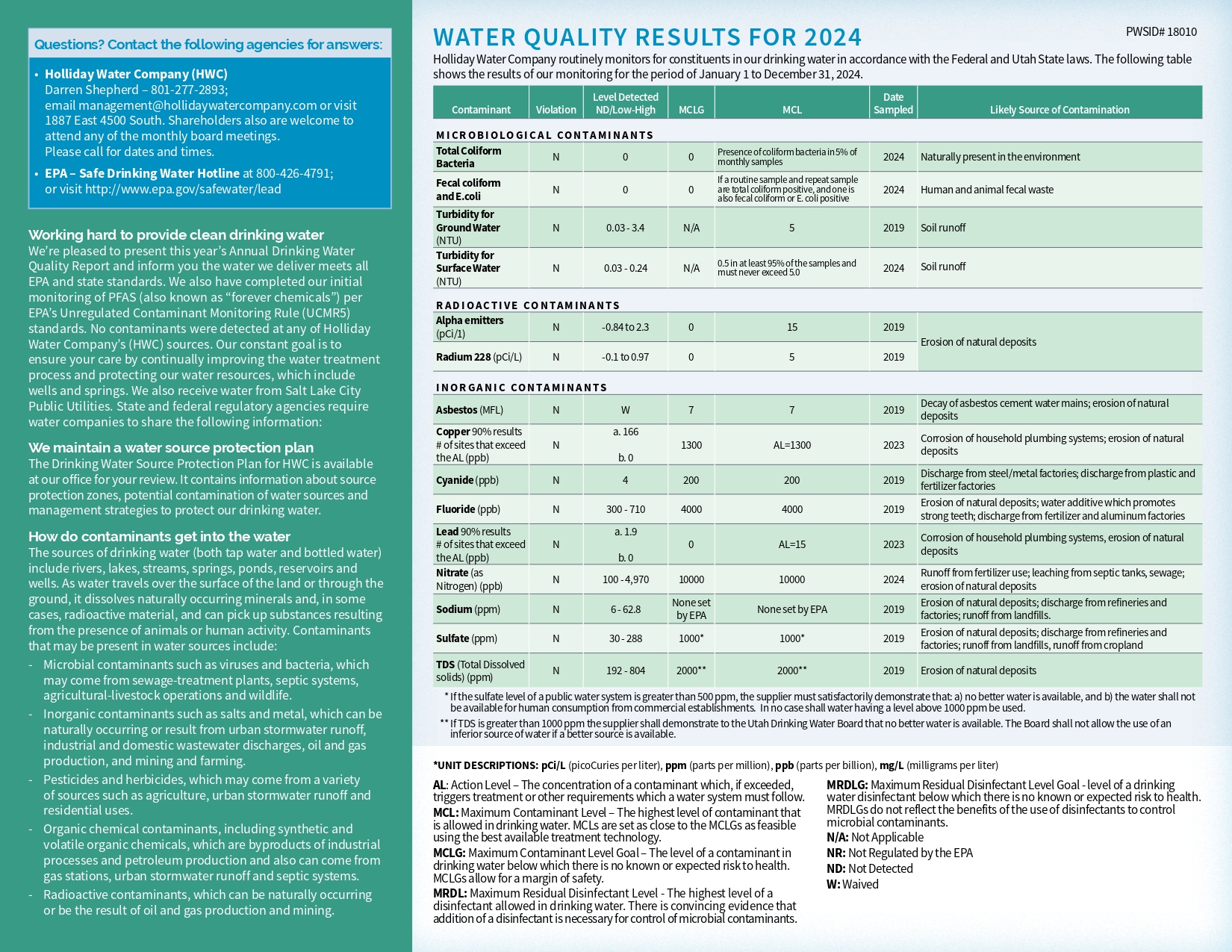 Each year we make available a short report that tells where your water comes from and what is in it. See below for the most recent report available, or call our office and we will gladly assist you.